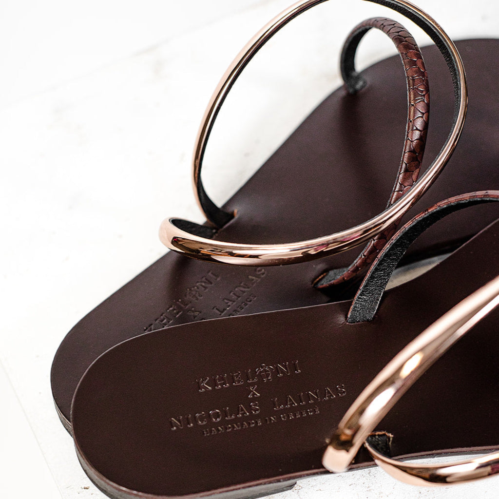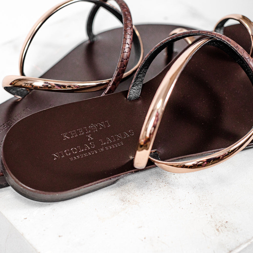 Designed by Nicolas Lainas in collaboration with Kheloni, the Elena sandals are made with an arch-style strap to provide support and a simple elegance With an ergonomic design the Elena sandals can be worn day or night.