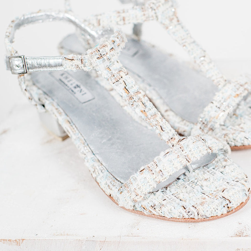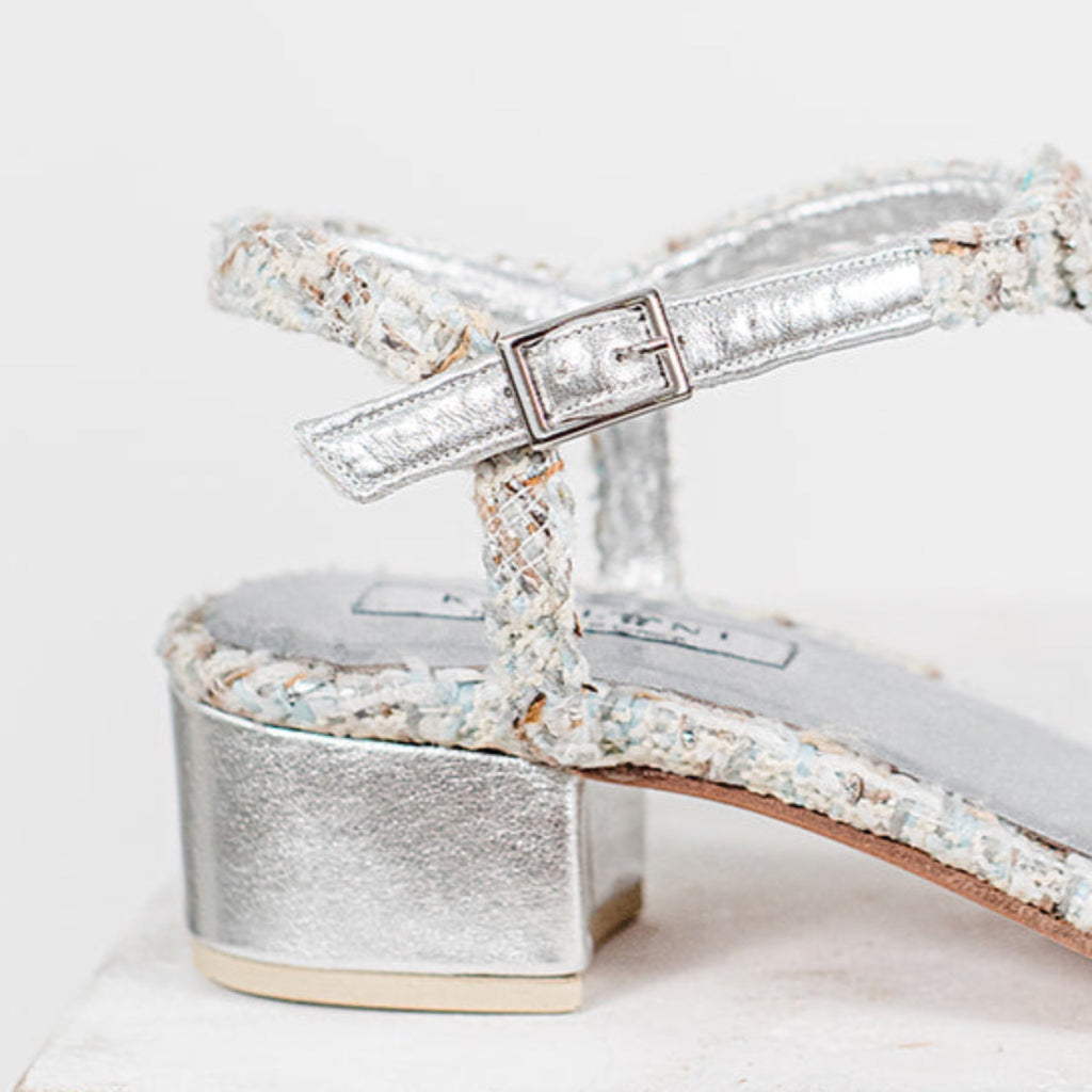 Our beautiful Maria sandal offered in metallic silver leather and Italian boucle make these sandals perfect for any occasion. We guarantee these elegant sandals will get noticed plus with our cushioned footbed and block heel, we made sure your feet will be happy too. These sandals are ideal for brides and bridal parties too. With a 1.5" heel height and cushioned insole you can dance the night away. Who said you have to sacrifice comfort for style?