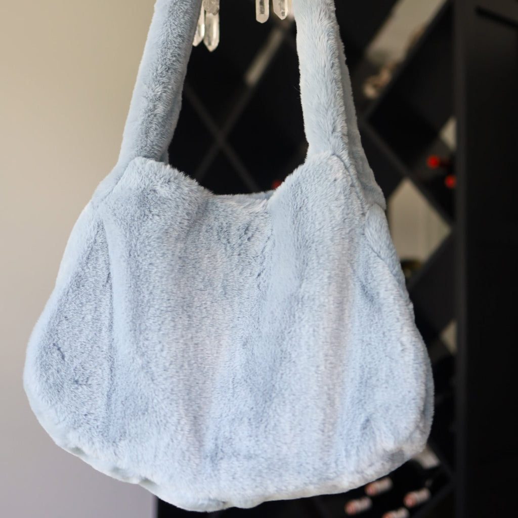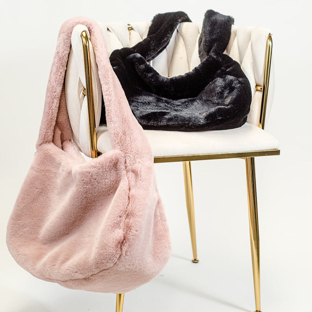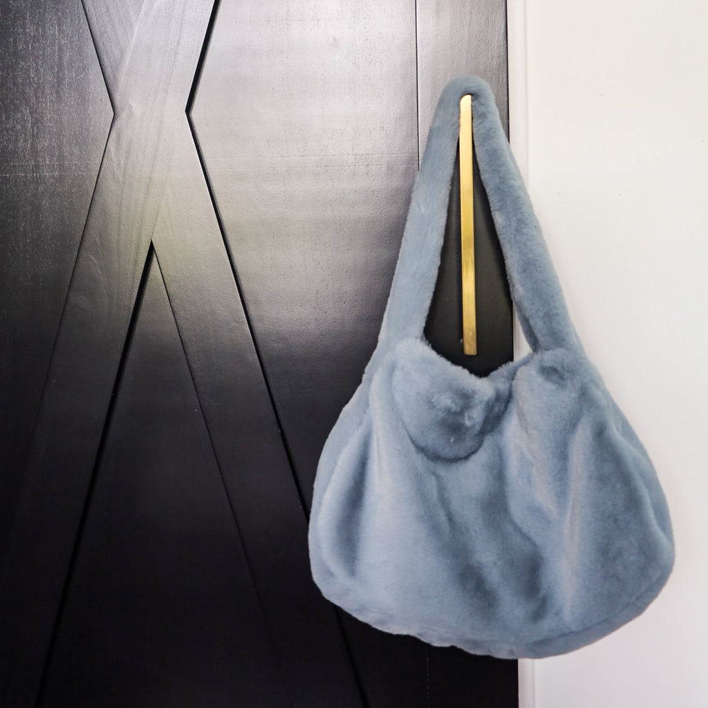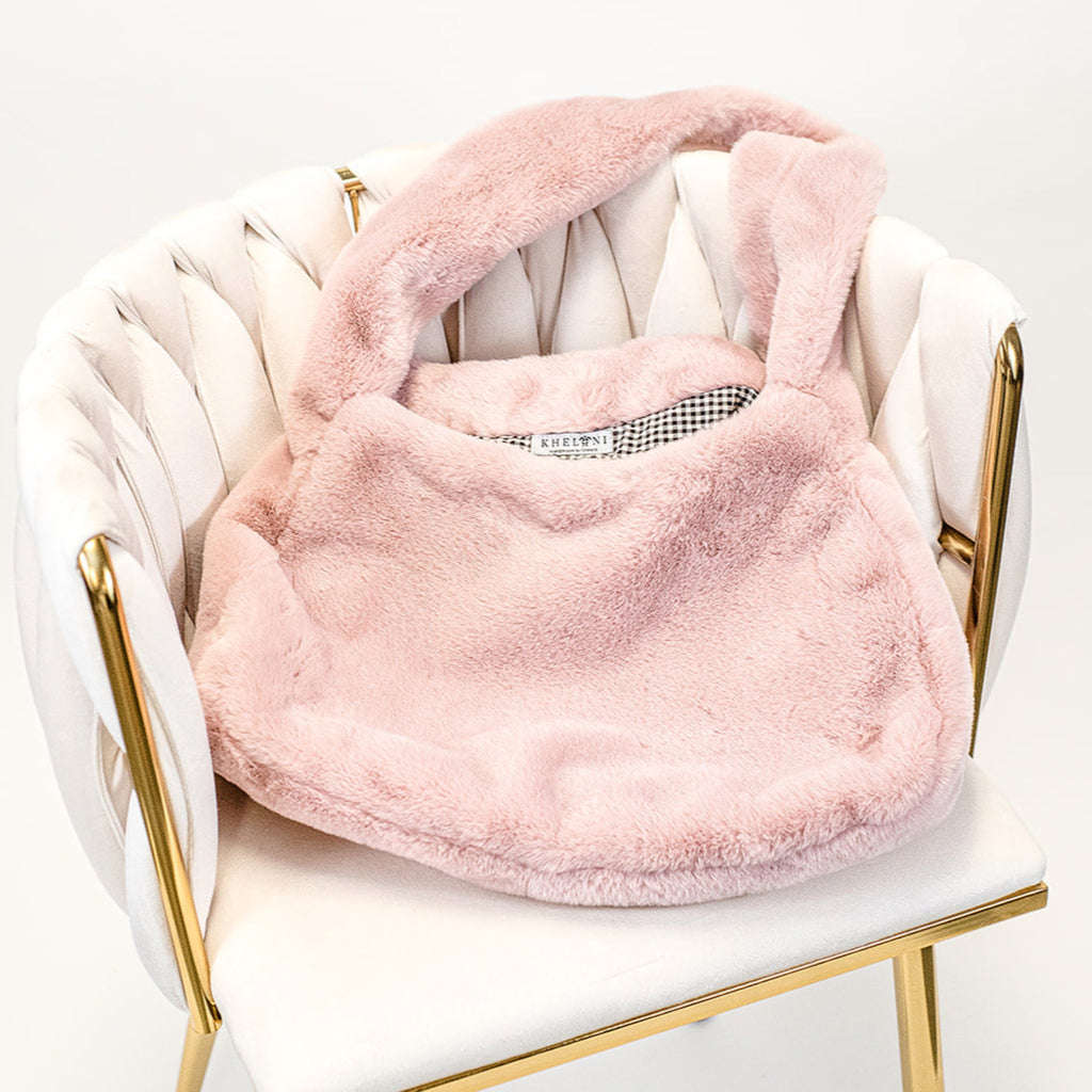 Using the same machine washable super soft faux fur on our popular slippers, we created the perfect compliment. This bag is oversized and so soft you will want to keep touching it. It is lightweight, has pockets for your cell phone and keys and roomy enough to fit a laptop or use when going to the gym. The magnetic closure keeps your belongings secure and it is lined with a fun gingham print.
